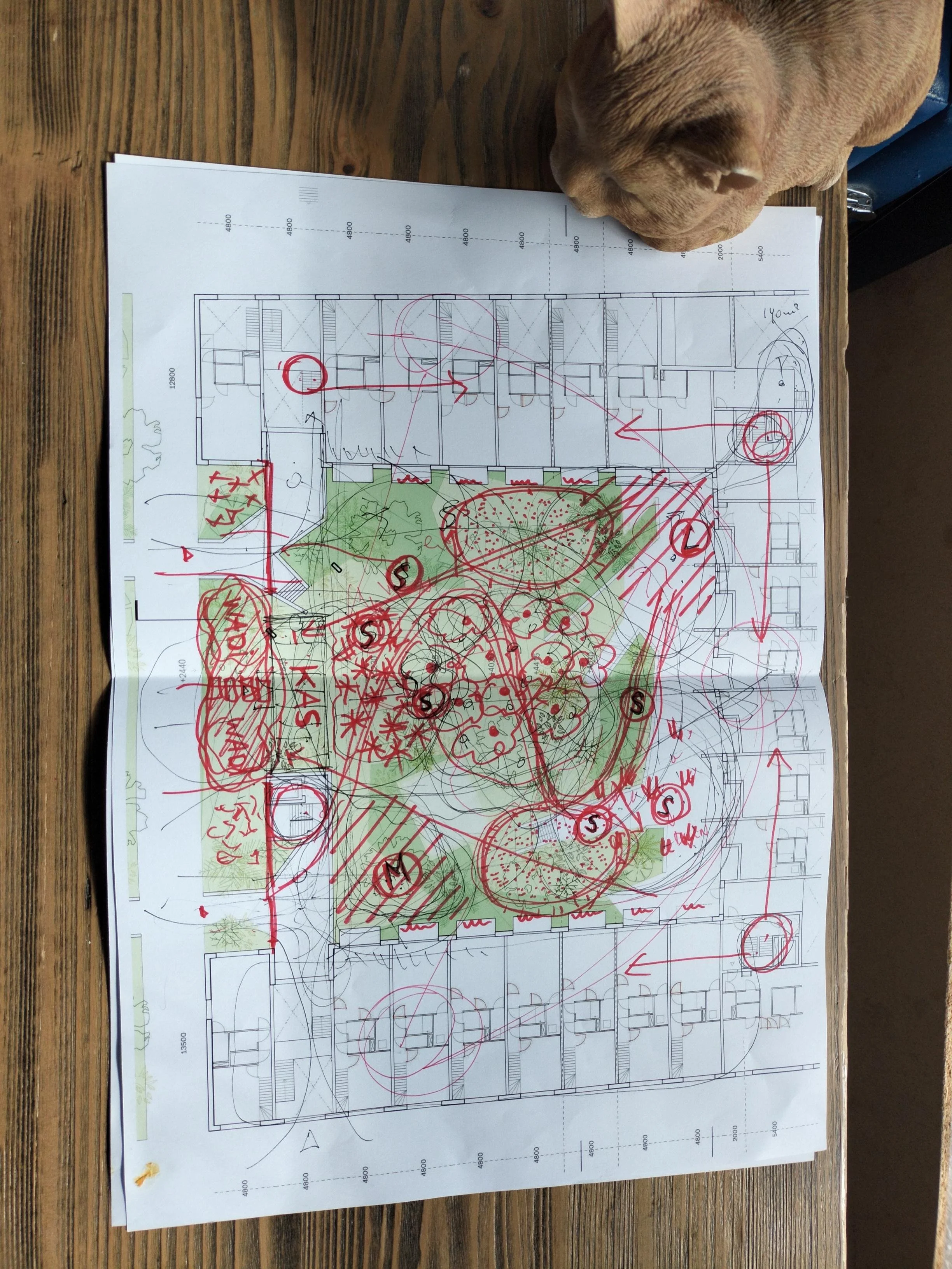 De deelnemers hebben met plattegronden van de binnentuin en de toolbox belangrijke input gegeven voor het ontwerp van het groene hart van het complex. Hierbij lag de nadruk op collectiviteit, private ontmoeting en veiligheid.